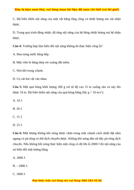được 10 m. Độ biến thiên nội năng của quả bóng bằng (lấy g = 10 m/s2). A. 10 J. B. 20 J. C. 15 J. D. 25 J.