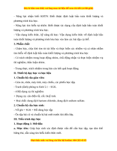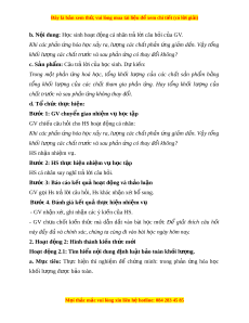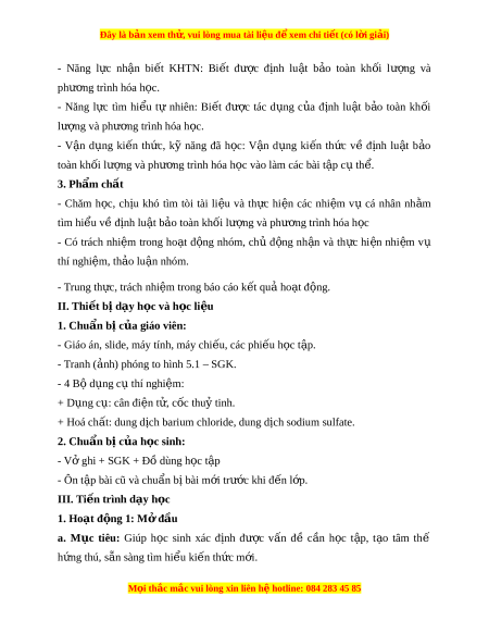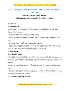 Đây là bản xem th , vu ử i lòng mua tài li u ệ đ xe ể m chi ti t ế (có l i ờ gi i ả ) - Năng l c ự nh n ậ bi t ế KHTN: Bi t ế đư c ợ đ nh ị lu t ậ b o ả toàn kh i ố lư ng ợ và phư ng ơ trình hóa h c. ọ - Năng l c ự tìm hi u ể tự nhiên: Bi t ế đư c ợ tác d ng ụ c a ủ đ nh ị lu t ậ b o ả toàn kh i ố lư ng ợ và phư ng t ơ rình hóa h c. ọ - V n ậ d ng ụ ki n ế th c, ứ kỹ năng đã h c: ọ V n ậ d ng ụ ki n ế th c ứ về đ nh ị lu t ậ b o ả toàn khối lư ng và ph ợ ư ng ơ trình hóa h c ọ vào làm các bài t p c ậ t ụ h . ể 3. Phẩm ch t ấ - Chăm h c, ọ ch u ị khó tìm tòi tài li u ệ và th c ự hi n ệ các nhi m ệ vụ cá nhân nh m ằ tìm hi u v ể ề định lu t ậ b o ả toàn kh i ố lư ng và ph ợ ư ng t ơ rình hóa h c ọ - Có trách nhi m ệ trong ho t ạ đ ng ộ nhóm, ch ủ đ ng ộ nh n ậ và th c ự hi n ệ nhi m ệ vụ thí nghi m ệ , th o l ả u n ậ nhóm. - Trung th c, ự trách nhi m ệ trong báo cáo k t ế qu ho ả t ạ đ ng. ộ II. Thi t ế b d ị y h ạ c ọ và h c l ọ i u ệ 1. Chuẩn b c ị a g ủ iáo viên:
