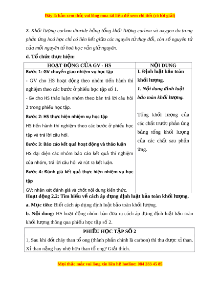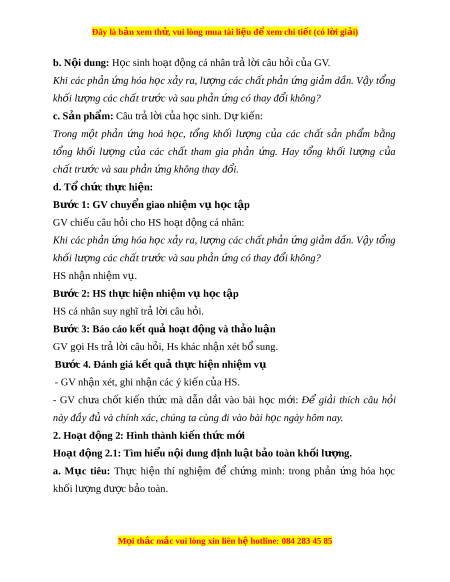 Đây là bản xem th , vu ử i lòng mua tài li u ệ đ xe ể m chi ti t ế (có l i ờ gi i ả ) b. N i ộ dung: H c s ọ inh ho t ạ đ ng cá ộ nhân trả l i ờ câu h i ỏ c a ủ GV. Khi các ph n ả ng ứ hóa h c ọ x y ả ra, lư ng ợ các ch t ấ ph n ả ng ứ gi m ả d n. V ầ y ậ t ng ổ khối lư ng các ợ ch t ấ trư c ớ và sau ph n ả ng có t ứ hay đ i ổ không?
