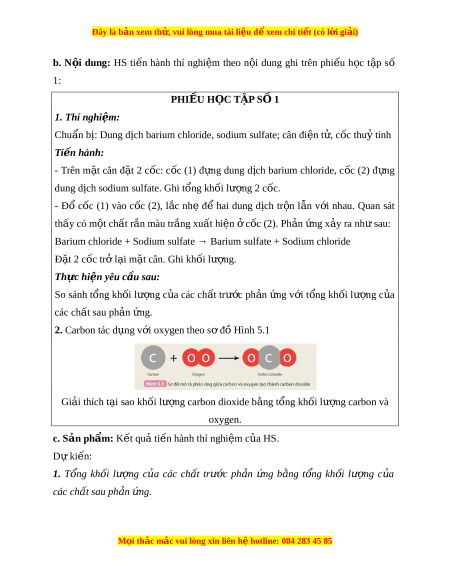 Barium chloride + Sodium sulfate → Barium sulfate + Sodium chloride Đ t ặ 2 cốc trở l i ạ m t ặ cân. Ghi kh i ố lư ng. ợ Th c ự hi n yêu c ệ u s ầ au: So sánh t ng ổ kh i ố lư ng ợ c a ủ các ch t ấ trư c ớ ph n ả ng ứ v i ớ t ng ổ kh i ố lư ng ợ c a ủ các chất sau ph n ả ng. ứ 2. Carbon tác d ng v ụ i ớ oxygen theo s đ ơ H ồ ình 5.1 Gi i ả thích t i ạ sao kh i ố lư ng car ợ bon dioxide b ng ằ t ng kh ổ i ố lư ng car ợ bon và oxygen. c. Sản phẩm: K t ế quả ti n hành t ế hí nghi m ệ c a H ủ S. Dự ki n: ế