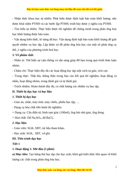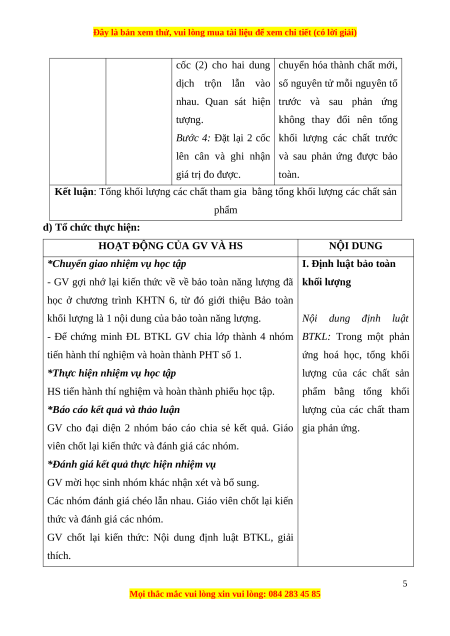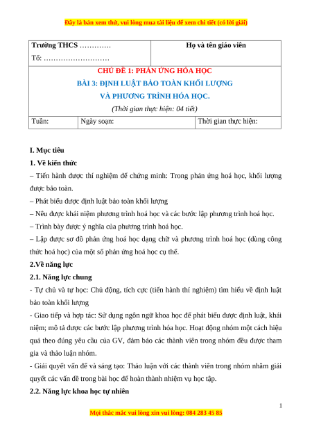- Nhận thức khoa học tự nhiên: Phát biểu được định luật bảo toàn khối lượng; nêu