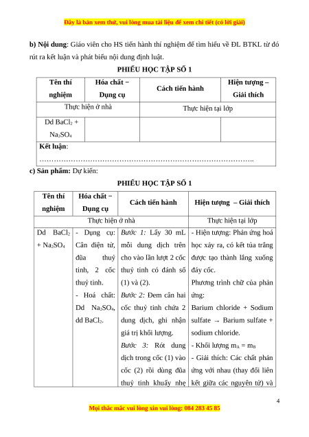 PHIẾU HỌC TẬP SỐ 1 Tên thí Hóa chất − Hiện tượng – Cách tiến hành nghiệm Dụng cụ Giải thích Thực hiện ở nhà Thực hiện tại lớp Dd BaCl2 + Na2SO4 Kết luận: