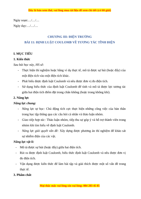 BÀI 11: ĐỊNH LUẬT COULOMB VỀ TƯƠNG TÁC TĨNH ĐIỆN I. MỤC TIÊU 1. Kiến thức