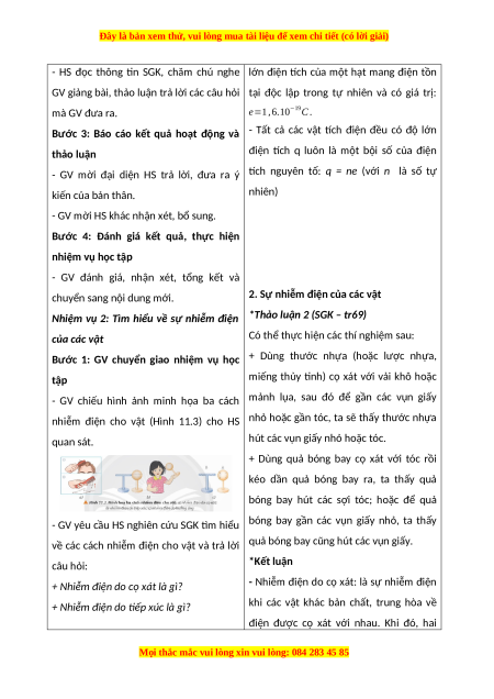 - HS thực hiện thí nghiệm hoặc bằng ví dụ thực tế để mô tả được các cách làm nhiễm điện một vật.