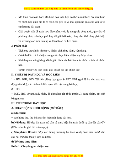 Năng lực riêng: tư duy và lập luận toán học, giao tiếp toán học; mô hình hóa toán