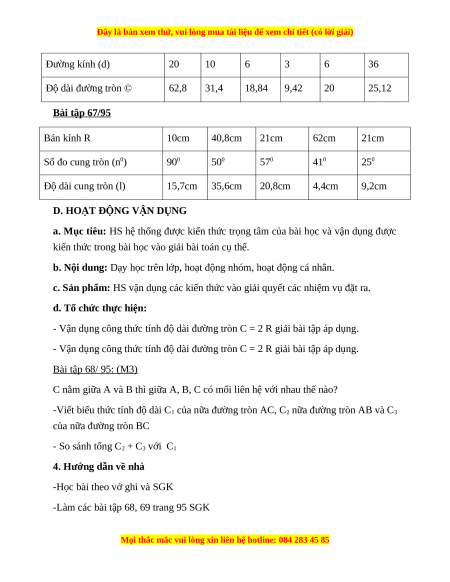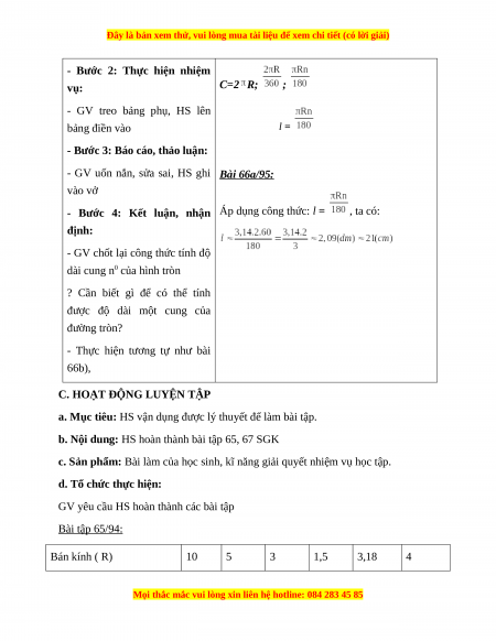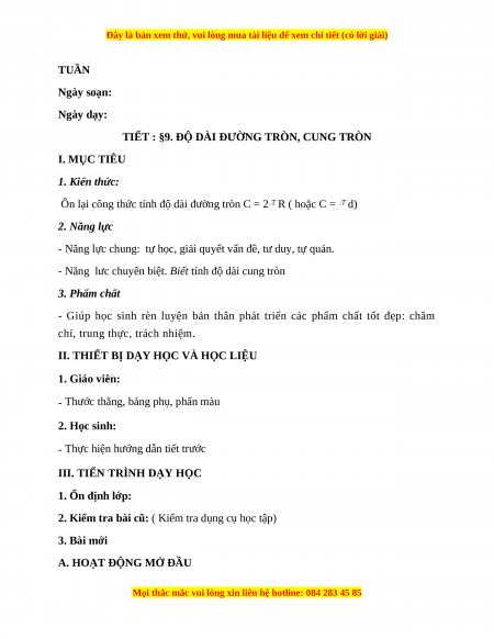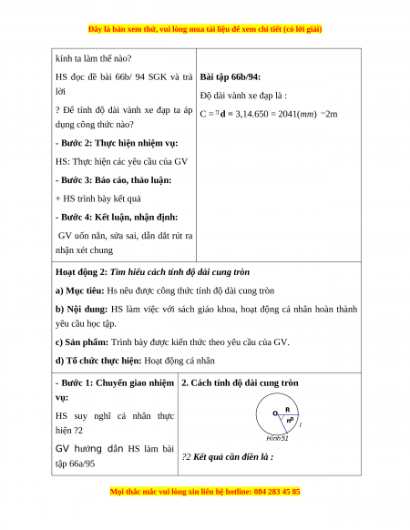 Giáo án Độ dài đường tròn. Cung tròn Toán 9 Học kì 2