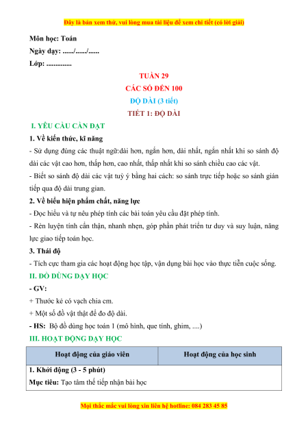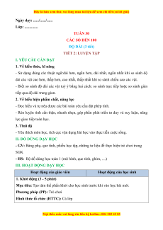Ngày dạy: ....../....../...... Lớp: .............. TUẦN 29 CÁC SỐ ĐẾN 100 ĐỘ DÀI (3 tiết) TIẾT 1: ĐỘ DÀI I. YÊU CẦU CẦN ĐẠT