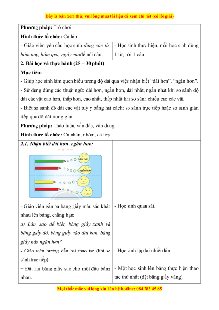 - Giúp học sinh làm quen biểu tượng độ dài qua việc nhận biết “dài hơn”, “ngắn hơn”.