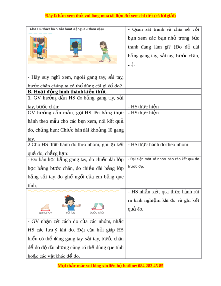 ớ chân chúng ta có th dùng cái ể gì đ đo? ể B. Hoạt đ ng hì ộ nh thành ki n t ế h c. ứ 1. GV hư ng ớ d n ẫ HS đo b ng ằ gang tay, s i ả tay, bư c ớ chân: - HS th c ự hi n ệ GV hư ng ớ d n ẫ m u, ẫ g i ọ HS lên b ng ả th c ự - HS th c ự hi n ệ hành theo m u ẫ cho các b n ạ xem, nói k t ế quả đo, ch ng ẳ h n: ạ Chi c ế bàn dài kho ng ả 10 gang tay. 2.Cho HS th c