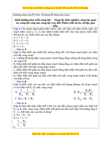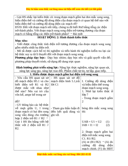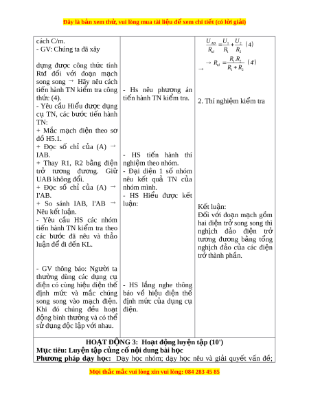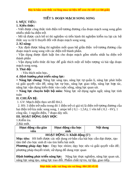 Đây là bản xem th , vu ử i lòng mua tài li u ệ đ xe ể m chi ti t (c ế ó l i ờ gi i ả ) TIẾT 5: ĐOẠN M C Ạ H SONG SONG I. M C Ụ TIÊU: 1. Ki n t ế h c ứ : - Vi t ế đư c ợ công th c t ứ ính đi n t ệ r t ở ư ng ơ đư ng c ơ a ủ đo n m ạ ch ạ song song g m ồ nhi u nh ề ất ba điện tr . ở - Mô tả đư c