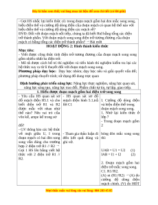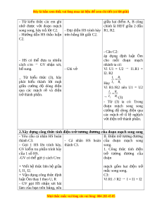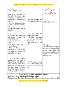 ể tra công - Hs nêu phư ng ơ án th c ứ (4). ti n hành ế TN ki m ể tra. 2. Thí nghiệm ki m ể tra - Yêu c u ầ Hi u ể đư c ợ d ng ụ cụ TN, các bư c ớ ti n ế hành TN: + M c ắ m ch ạ đi n ệ theo sơ đồ H5.1. + Đ c ọ số chỉ c a ủ (A) IAB. - HS ti n ế hành thí + Thay R1, R2 b ng ằ đi n ệ nghiệm theo nhóm. trở tư ng ơ đư ng. ơ Giữ - Đ i ạ di n ệ 1 số nhóm UAB không đ i ổ . nêu k t ế quả TN c a ủ + Đ c ọ số chỉ c a ủ (A) nhóm mình. I'AB. - HS Hi u ể đư c ợ k t ế + So sánh IAB, I'AB lu n: ậ K t ế lu n: ậ Nêu k t ế lu n. ậ Đối v i ớ đo n ạ m ch ạ g m ồ - Yêu c u ầ HS các nhóm hai đi n ệ trở song song thì ti n ế hành TN ki m ể tra theo nghịch đ o ả đi n ệ trở các bư c ớ đã nêu và th o ả tư ng ơ đư ng ơ b ng ằ t ng ổ lu n ậ đ đi ể đ n K ế L. nghịch đ o ả c a ủ các đi n ệ tr t ở hành phần. - GV thông báo: Ngư i ờ ta thư ng ờ dùng các d ng ụ cụ điện có cùng hi u ệ đi n ệ thế - HS l ng ắ nghe thông định m c ứ và m c ắ chúng báo về hi u ệ đi n ệ thế song song vào m ch ạ đi n. ệ định m c ứ c a ủ d ng ụ cụ Khi đó chúng đ u ề ho t ạ điện. đ ng ộ bình thư ng ờ và có thể sử d ng đ ụ c ộ l p v ậ i ớ nhau. HOẠT Đ N Ộ G 3: Ho t ạ đ ng l ộ uy n t ệ p ( ậ 10') Mục tiêu: Luy n ệ t p c ậ ng c ủ n ố i ộ dung bài h c ọ Phư ng ơ pháp d y ạ h c: ọ D y ạ h c ọ nhóm; d y ạ h c ọ nêu và gi i ả quy t ế v n ấ đề; M i ọ thắc m c
