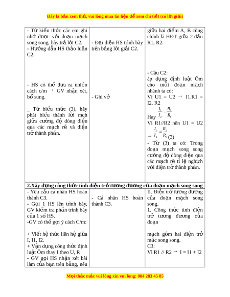 Đây là bản xem th , vu ử i lòng mua tài li u ệ đ xe ể m chi ti t (c ế ó l i ờ gi i ả ) - Từ ki n ế th c ứ các em ghi gi a ữ hai đi m ể A, B cũng nhớ đư c ợ v i ớ đo n ạ m ch ạ chính là HĐT gi a ữ 2 đ u ầ song song, hãy tr l ả i ờ C2. - Đ i ạ di n ệ HS trình bày R1, R2. - Hư ng ớ d n ẫ HS th o ả lu n ậ trên b ng l ả i ờ gi i ả C2. C2. - Câu C2: áp d ng ụ đ nh ị lu t ậ Ôm - HS có thể đ a ư ra nhi u ề cho mỗi đo n ạ m ch ạ cách c/m GV nh n ậ xét, nhánh ta có: bổ sung. - Ghi vở Vì U1 = U2 I1.R1 = I2. R2 _ Từ bi u ể th c ứ (3), hãy I R 1 2 phát bi u ể thành l i ờ mqh Hay I R 2 1 gi a ữ cư ng ờ độ dòng đi n ệ Vì R1//R2 nên U1 = U2 qua các m ch ạ rẽ và đi n ệ I R tr t ở hành phần. 1 2 I R 2 1 (3) - Từ (3) ta có: Trong đo n ạ m ch ạ song song cư ng ờ độ dòng đi n ệ qua các m ch ạ rẽ tỉ lệ ngh ch ị v i ớ đi n t ệ r t ở hành ph n. ầ