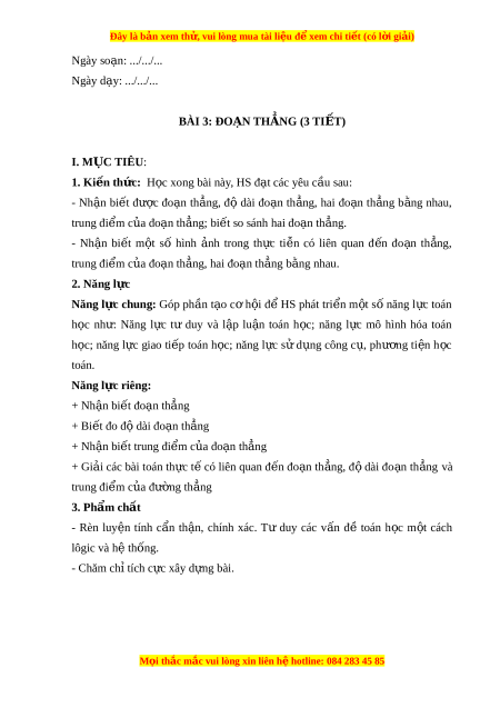 BÀI 3: ĐOẠN THẲNG (3 TI T Ế ) I. M C Ụ TIÊU: 1. Ki n t ế h c ứ : H c ọ xong bài này, HS đ t ạ các yêu c u s ầ au: - Nh n ậ bi t ế đư c ợ đo n ạ th ng, ẳ độ dài đo n ạ th ng, ẳ hai đo n ạ th ng ẳ b ng ằ nhau, trung đi m ể c a ủ đo n t ạ h ng; ẳ bi t ế so sánh hai đo n t ạ h ng. ẳ - Nh n ậ bi t ế m t ộ số hình nh ả trong th c ự ti n ễ có liên quan đ n ế đo n ạ th ng, ẳ trung đi m ể c a ủ đo n t ạ h ng, ẳ hai đo n t ạ h ng ẳ b ng nhau. ằ 2. Năng l c ự Năng l c ự chung: Góp ph n ầ t o ạ c ơ h i ộ đ ể HS phát tri n ể m t ộ s ố năng l c ự toán h c ọ nh : ư Năng l c ự tư duy và l p ậ lu n ậ toán h c; ọ năng l c ự mô hình hóa toán h c; ọ năng l c ự giao ti p ế toán h c; ọ năng l c ự s ử d ng ụ công c , ụ phư ng ơ ti n ệ h c ọ toán. Năng l c ự riêng: + Nh n bi ậ t ế đo n ạ th ng ẳ + Bi t ế đo đ dài ộ đo n ạ th ng ẳ + Nh n bi ậ t ế trung đi m ể c a đo ủ n ạ th ng ẳ + Gi i ả các bài toán th c ự t ế có liên quan đ n ế đo n ạ th ng, ẳ đ ộ dài đo n ạ th ng ẳ và trung đi m ể c a ủ đư ng t ờ h ng ẳ 3. Ph m ẩ chất - Rèn luy n ệ tính c n ẩ th n,