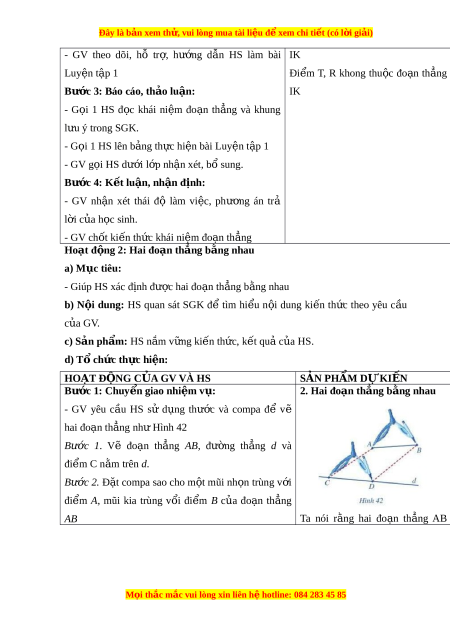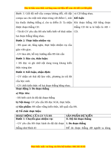 d) Tổ chức thực hi n: ệ HOẠT Đ N Ộ G C A Ủ GV VÀ HS SẢN PHẨM D K Ự I N Ế Bư c ớ 1: Chuy n gi ể ao nhi m ệ v : ụ I. HAI ĐO N Ạ TH N Ẳ G B N Ằ G - GV yêu c u ầ HS đ t ặ c nh ạ thư c ớ th ng ẳ đi qua NHAU hai đi m ể cho trư c ớ và v ẽ đư ng ờ n i ố hai đi m ể đó 1. Khái ni m ệ đo n t ạ h ng ẳ nh H ư ình 39. Đo n ạ th ng ẳ AB là hình g m ồ đi m ể - Từ đó GV yêu c u ầ HS nêu hi u ể bi t ế thế nào là A, đi m ể B và t t ấ cả các đi m ể n m ằ đo n t ạ h ng ẳ AB gi a ữ A và B. - GV nh c ắ cho HS cách g i ọ th ứ hai c a ủ m t ộ đo n ạ th ng ẳ khung l ở u ư ý A B - GV hư ng ớ d n ẫ HS th c ự hi n ệ VD1, yêu c u ầ HS Đo n ạ th ng ẳ AB cũng g i ọ là đo n ạ ph i ả nh n ậ bi t ế đư c ợ đi m ể thu c ộ đo n ạ th ng, ẳ th ng B ẳ A đi m ể không thu c đo ộ n ạ th ng. ẳ Luy n t ệ ập 1 - Áp d ng