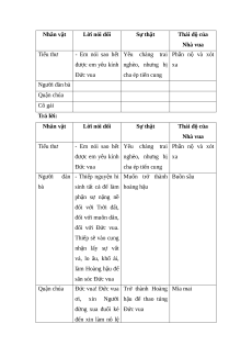 việc đó ra sao? Tham khảo bảng sau (làm vào vở): Nhân vật Lời nói dối Sự thật Thái độ của Nhà vua Tiểu thư