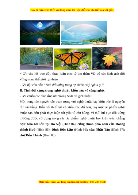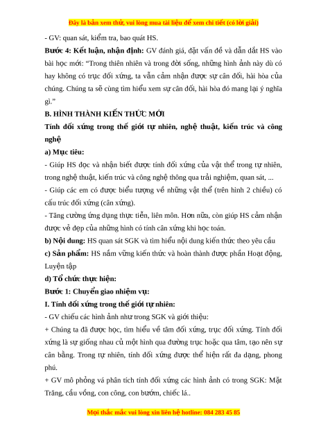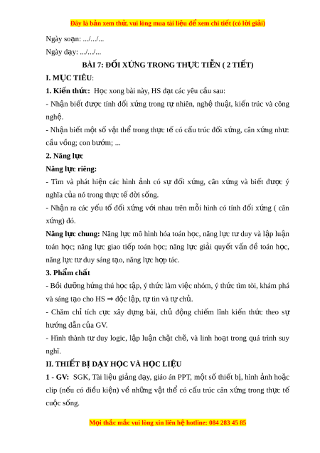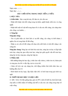 Đây là bản xem th , vu ử i lòng mua tài li u ệ đ xe ể m chi ti t ế (có l i ờ gi i ả ) Ngày so n: ạ .../.../... Ngày d y: ạ .../.../... BÀI 7: Đ I Ố X N Ứ G TRONG TH C Ự TI N Ễ ( 2 TI T Ế ) I. M C Ụ TIÊU: 1. Ki n t ế h c ứ : H c ọ xong bài này, HS đ t ạ các yêu c u s ầ au: - Nh n ậ bi t ế đư c ợ tính đ i ố x ng ứ trong tự nhiên, ngh ệ thu t ậ , ki n ế trúc và công nghệ. - Nh n ậ bi t ế m t ộ số v t ậ th ể trong th c ự t ế có c u ấ trúc đ i ố x ng, ứ cân x ng ứ nh : ư cầu vồng; con bư m ớ ; ... 2. Năng l c ự Năng l c ự riêng: - Tìm và phát hi n ệ các hình nh ả có sự đ i ố x ng, ứ cân x ng ứ và bi t ế đư c ợ ý nghĩa c a nó t ủ rong th c t ự đ ế i ờ sống. - Nh n ậ ra các y u ế tố đ i ố x ng ứ v i ớ nhau trên m i ỗ hình có tính đ i ố x ng ứ ( cân x ng) ứ đó. Năng l c ự chung: Năng l c ự mô hình hóa toán h c, ọ năng l c ự t ư duy và l p ậ lu n ậ toán h c; ọ năng l c ự giao ti p ế toán h c; ọ năng l c ự gi i ả quy t ế v n ấ đề toán h c, ọ năng l c t ự duy s ư áng t o, năng ạ l c h ự p t ợ ác. 3. Ph m ẩ chất - Bồi dư ng ỡ h ng t ứ hú h c t ọ p, ậ ý th c l ứ àm vi c nhóm ệ , ý th c t ứ ìm tòi, khám phá và sáng t o cho H ạ S ⇒ đ c l ộ p, ậ t t ự in và t ch ự . ủ - Chăm chỉ tích c c ự xây d ng ự bài, chủ đ ng ộ chi m ế lĩnh ki n ế th c ứ theo sự hư ng d ớ ẫn c a G ủ V.