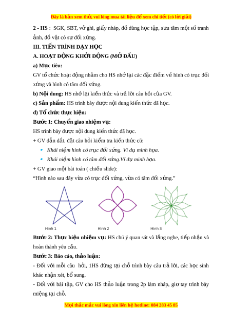III. TIẾN TRÌNH DẠY H C Ọ A. HOẠT Đ N Ộ G KH I Ở Đ N Ộ G (M Đ Ở U Ầ ) a) M c t ụ iêu: GV tổ ch c ứ ho t ạ đ ng nh ộ m ằ cho HS nh l ớ i ạ các đ c đi ặ m ể về hình có tr c ụ đ i ố x ng và hì ứ nh có tâm đối x ng. ứ b) N i ộ dung: HS nh l ớ i ạ ki n t ế h c ứ và tr l ả i ờ câu h i ỏ c a ủ GV. c) Sản ph m