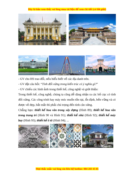 ế rúc và công ngh . ệ - GV chi u các ế hình nh nh ả t ư rong SGK và gi i ớ thi u: ệ M t ộ trong các nguyên t c ắ quan tr ng ọ v i ớ nghệ thu t ậ hay ki n ế trúc là nguyên t c ắ cân b ng. ằ H u ầ h t ế thi t ế k ế v ề ki n ế trúc, đ ồ ho , ạ hay m t ộ tác ph m ẩ nghệ thu t ậ nào đ u ề ph i ả th c ự hi n ệ t t ố y u ế tố cân b ng. ằ Vì th , ế bố c c ụ đ i ố x ng ứ thư ng ờ đư c ợ sử d ng ụ trong các tác ph m ẩ nghệ thu t ậ hay ki n ế trúc, ch ng ẳ h n: ạ Nhà hát l n ớ t i ạ Hà N i