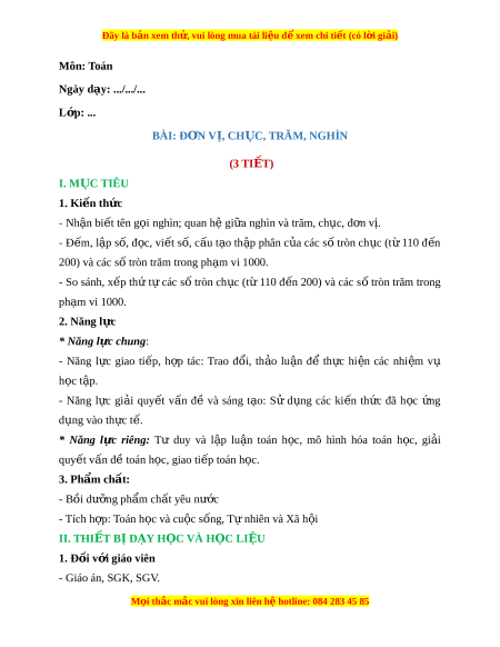 Ngày dạy: .../.../... L p: ớ ... BÀI: Đ N Ơ V , C Ị H C Ụ , TRĂM, NGHÌN (3 TIẾT) I. M C Ụ TIÊU 1. Ki n t ế h c ứ - Nh n bi ậ t ế tên g i ọ nghìn; quan hệ gi a ữ nghìn và trăm, ch c, ụ đ n v ơ . ị - Đ m ế , l p ậ s , ố đ c, ọ vi t ế s , ố c u ấ t o ạ th p ậ phân c a ủ các s ố tròn ch c ụ (t ừ 110 đ n ế