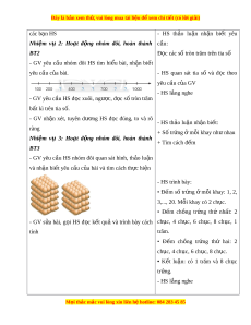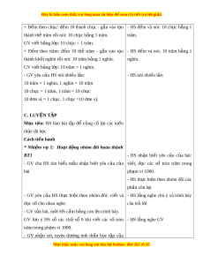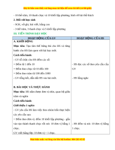 Đây là bản xem th , vu ử i lòng mua tài li u ệ đ xe ể m chi ti t (c ế ó l i ờ gi i ả ) - 10 th t ẻ răm, 10 thanh ch c ụ và 10 kh i ố l p ph ậ ư ng, hì ơ nh v bài ẽ th t ử hách 2. Đ i ố v i ớ h c s ọ inh - SGK, v ghi ở , bút vi t ế , b ng con ả - 3 th t ẻ răm, 3 thanh ch c ụ và 5 kh i ố l p ph ậ ư ng ơ III. TI N Ế TRÌNH D Y Ạ H C Ọ HOẠT Đ N Ộ G C A Ủ GV HOẠT Đ N Ộ G C A Ủ HS A. KH I Ở Đ N Ộ G Mục tiêu: T o ạ tâm thế h ng ứ thú cho HS và t ng ừ bư c ớ cho HS làm quen v i ớ bài h c ọ m i ớ . Cách ti n hà ế nh: - GV tổ ch c ứ cho HS đ m ế các s : ố + Đ m ế t 1 đ ừ n ế 10 - HS đ c ọ các s ố theo yêu c u ầ c a ủ + Đ m ế theo ch c ụ t 10 đ ừ n 100 ế GV + Đ m ế theo trăm t 100 đ ừ n 1000 ế - GV tổng k t ế , d n d ẫ t ắ HS vào bài m i ớ . - HS l ng nghe ắ B. BÀI H C Ọ VÀ TH C Ự HÀNH Mục tiêu: HS n m ắ đư c ợ đ n ơ vị nhìn, quan h ệ gi a ữ trăm và nghìn Cách ti n hà ế nh: Gi i