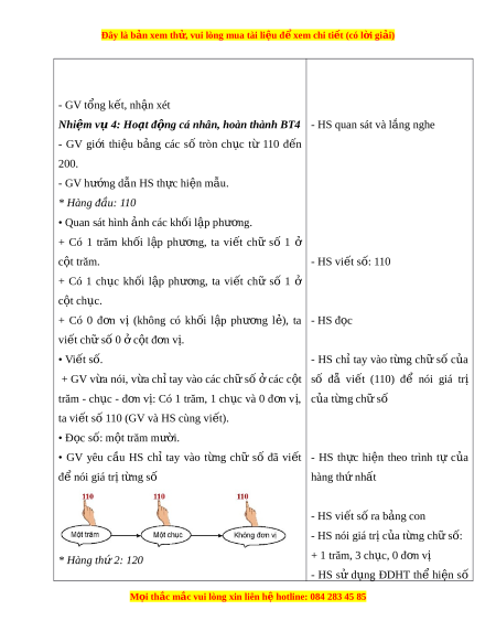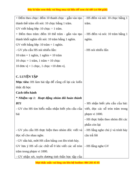 Đây là bản xem th , vu ử i lòng mua tài li u ệ đ xe ể m chi ti t (c ế ó l i ờ gi i ả ) + Đ m ế theo ch c: ụ đ m ế 10 thanh ch c ụ - g n ắ vào t o ạ - HS đ m ế và nói: 10 ch c ụ b ng ằ 1 thành th t ẻ răm r i ồ nói: 10 ch c b ụ ng ằ 1 trăm. trăm. GV vi t ế b ng l ả p: ớ 10 ch c ụ = 1 trăm. + Đ m ế theo trăm: đ m ế 10 thẻ trăm - g n ắ vào t o ạ - HS đ m ế và nói: 10 trăm b ng ằ 1