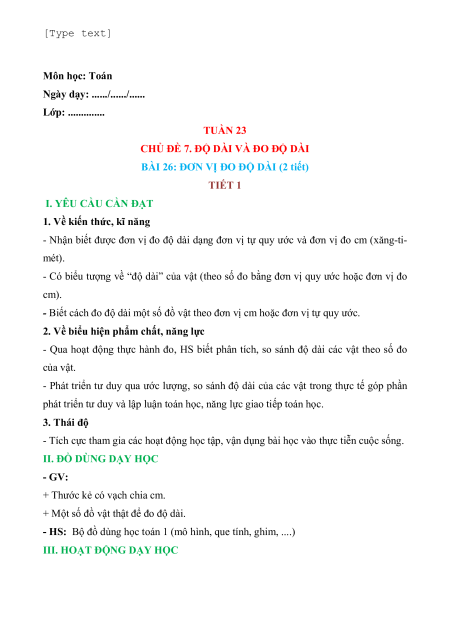 BÀI 26: ĐƠN VỊ ĐO ĐỘ DÀI (2 tiết) TIẾT 1 I. YÊU CẦU CẦN ĐẠT
