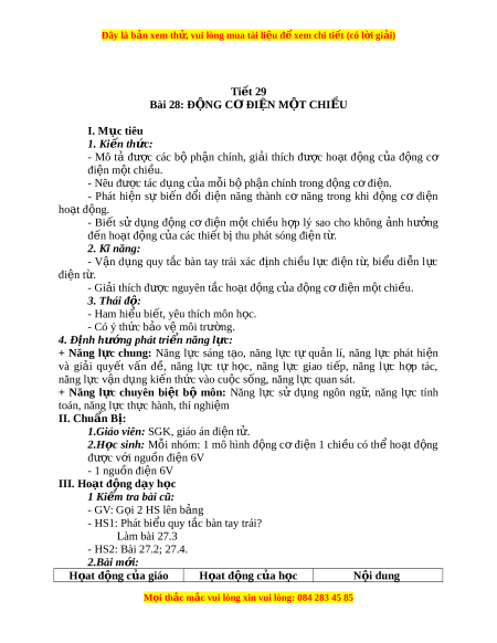 Đây là bản xem th , vu ử i lòng mua tài li u ệ đ xe ể m chi ti t (c ế ó l i ờ gi i ả ) Ti t ế 29 Bài 28: Đ N Ộ G C Đ Ơ I N Ệ M T Ộ CHI U Ề I. M c t ụ iêu 1. Ki n ế th c: ứ - Mô tả đư c ợ các bộ ph n ậ chính, gi i ả thích đư c ợ ho t ạ đ ng ộ c a ủ đ ng ộ cơ điện m t ộ chi u. ề - Nêu đư c ợ tác d ng c ụ a ủ m i ỗ b ph ộ n ậ chính trong đ ng ộ c đi ơ n. ệ - Phát hi n ệ sự bi n ế đ i ổ đi n