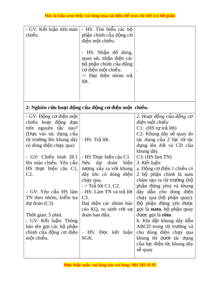 Đây là bản xem th , vu ử i lòng mua tài li u ệ đ xe ể m chi ti t (c ế ó l i ờ gi i ả ) - GV: K t ế lu n ậ trên màn - HS: Tìm hi u ể các bộ chi u. ế ph n ậ chính c a ủ đ ng ộ cơ điện m t ộ chi u. ề - HS: Nh n ậ đồ dùng, quan sát, nh n ậ di n ệ các bộ ph n ậ chính c a ủ đ ng ộ c đi ơ ện m t ộ chi u. ề . -> Đ i ạ di n ệ nhóm trả l i ờ . 2: Nghiên c u ho ứ t ạ đ ng c ộ a đ ủ ng c ộ đi ơ n m ệ t ộ chi u. ề - GV: Đ ng ộ cơ đi n ệ m t ộ 2. Ho t ạ đ ng ộ c a ủ đ ng ộ cơ chi u ề ho t ạ đ ng ộ d a ự điện m t ộ chi u ề trên nguyên t c ắ nào? C1: (HS t t ự r l ả i ờ ) (D a ự vào tác d ng ụ c a ủ C2: Khung dây sẽ quay do từ trư ng ờ lên khung dây - HS: Tr l ả i ờ . tác d ng ụ c a ủ 2 l c ự từ tác có dòng điện ch y ạ qua) d ng ụ lên AB và CD c a ủ khung dây. - GV: Chi u ế hình 28.1 - HS Th c ự hi n câu ệ C1. C3: (HS làm TN) lên màn chi u. ế Yêu c u ầ Nêu dự đoán hi n ệ 3. K t ế lu n: ậ HS th c ự hi n ệ câu C1, tư ng ợ x y ả ra v i ớ khung a. Đ ng ộ cơ đi n ệ 1 chi u ề có C2. dây khi có dòng đi n ệ 2 bộ ph n ậ chính là nam ch y qua. ạ châm t o ạ ra từ trư ng ờ (bộ - > Tr l ả i ờ C1, C2. ph n ậ đ ng ứ yên) và khung - GV: Yêu c u
