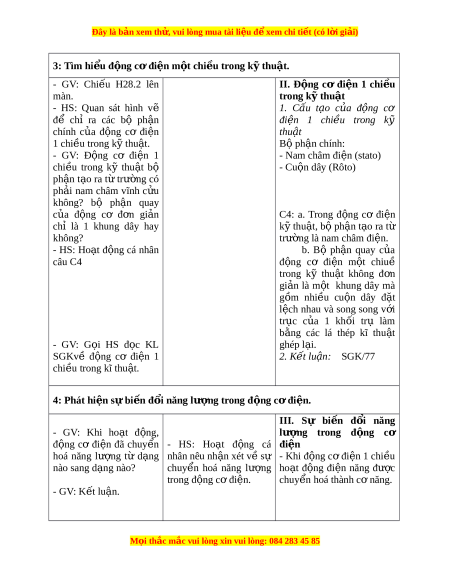Đây là bản xem th , vu ử i lòng mua tài li u ệ đ xe ể m chi ti t (c ế ó l i ờ gi i ả ) 3: Tìm hi u đ ể ng c ộ ơ đi n m ệ t ộ chi u t ề rong kỹ thu t ậ . - GV: Chi u ế H28.2 lên II. Đ ng ộ cơ đi n ệ 1 chi u ề màn. trong k t ỹ hu t ậ - HS: Quan sát hình vẽ 1. Cấu t o ạ c a ủ đ ng ộ cơ để chỉ ra các bộ ph n ậ điện 1 chi u ề trong kỹ chính c a ủ đ ng ộ cơ đi n ệ thu t ậ 1 chi u ề trong k t ỹ hu t ậ . Bộ ph n chí ậ nh: - GV: Đ ng ộ cơ đi n ệ 1 - Nam châm đi n ( ệ stato) chi u ề trong kỹ thu t ậ bộ - Cu n ộ dây (Rôto) ph n ậ t o ạ ra t ừ trư ng ờ có ph i ả nam châm vĩnh c u ử không? bộ ph n ậ quay c a ủ đ ng ộ cơ đ n ơ gi n ả C4: a. Trong đ ng ộ cơ đi n ệ chỉ là 1 khung dây hay k ỹ thu t ậ , b ph ộ n ậ t o ạ ra từ không? trư ng l ờ à nam châm đi n. ệ - HS: Ho t ạ đ ng ộ cá nhân b. Bộ ph n ậ quay c a ủ câu C4 đ ng ộ cơ đi n ệ m t ộ chiuề trong kỹ thu t ậ không đ n ơ gi n ả là m t ộ khung dây mà gồm nhi u ề cu n ộ dây đ t ặ lệch nhau và song song v i ớ tr c ụ c a ủ 1 kh i ố trụ làm b ng ằ các lá thép kĩ thu t ậ - GV: G i ọ HS đ c ọ KL ghép l i ạ . SGKvề đ ng ộ cơ đi n ệ 1 2. K t ế lu n ậ : SGK/77 chi u ề trong kĩ thu t ậ . 4: Phát hi n s ệ ự bi n đ ế i ổ năng lư ng t ợ rong đ ng c ộ ơ đi n. ệ III. Sự bi n ế đ i ổ năng - GV: Khi ho t ạ đ ng, ộ lư ng ợ trong đ ng ộ cơ đ ng ộ cơ đi n ệ đã chuy n ể - HS: Ho t ạ đ ng ộ cá đi n ệ hoá năng lư ng ợ từ d ng ạ nhân nêu nh n ậ xét v s ề ự - Khi đ ng ộ c ơ đi n ệ 1 chi u ề nào sang d ng ạ nào? chuy n ể hoá năng lư ng ợ ho t ạ đ ng ộ đi n ệ năng đư c ợ trong đ ng ộ c đi ơ n. ệ chuy n ể hoá thành c năng. ơ - GV: K t ế lu n. ậ M i ọ thắc m c