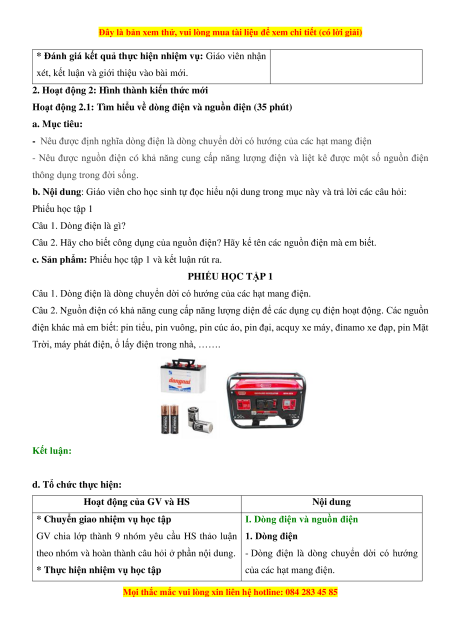 Hoạt động 2.1: Tìm hiểu về dòng điện và nguồn điện (35 phút) a. Mục tiêu: