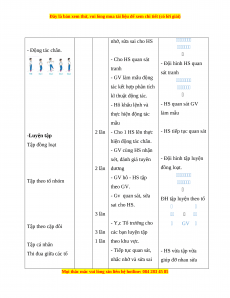 nhở, sửa sai cho HS - Động tác chân. - Cho HS quan sát - Đội hình HS quan tranh sát tranh - GV làm mẫu động tác kết hợp phân tích kĩ thuật động tác. - Hô khẩu lệnh và - HS quan sát GV thực hiện động tác làm mẫu mẫu