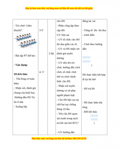 cho HS động tác sai - Trò chơi “chèo - Phân công tập theo thuyền”. 3-5’ cặp đôi - Từng tổ lên thi đua GV Sửa sai - trình diễn - GV tổ chức cho HS thi đua giữa các tổ. - Chơi theo hướng - GV và HS nhận xét dẫn 2 lần đánh giá tuyên - Bài tập PT thể lực: dương. - GV nêu tên trò - Vận dụng: chơi, hướng dẫn cách 4- 5’ chơi, tổ chức chơi III.Kết thúc HS thực hiện kết hợp thở và chơi chính - Thả lỏng cơ toàn đi lại hít thở thức cho HS. thân. - Nhận xét tuyên - Nhận xét, đánh giá - HS trả lời dương và sử phạt chung của buổi học. người phạm luật Hướng dẫn HS Tự - Cho HS bật cao tại ôn ở nhà - HS thực hiện thả chỗ hai tay chống - Xuống lớp lỏng hông 10 lần - ĐH kết thúc - Yêu cầu HS quan sát tranh trong sách trả lời câu hỏi BT1? - GV hướng dẫn