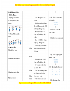 Phương pháp, tổ chức và yêu cầu Nội dung T. S. Hoạt động GV Hoạt động HS gian lần I. Phần mở đầu 5 – 7’ Nhận lớp Gv nhận lớp, thăm Đội hình nhận lớp hỏi sức khỏe học sinh phổ biến nội dung, Khởi động 2x8N yêu cầu giờ học - HS khởi động theo - Xoay các khớp cổ - GV HD học sinh GV. tay, cổ chân, vai, khởi động. hông, gối,... 2x8N - Bài thể dục PTC. - GV hô nhịp, HS tập - Trò chơi “anh em 2-3’ đoàn kết”