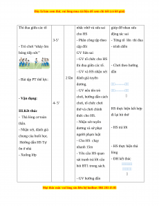 - Phân công tập theo - Từng tổ lên thi đua - Trò chơi “nhảy ôm cặp đôi - trình diễn bóng tiếp sức” GV Sửa sai - GV tổ chức cho HS thi đua giữa các tổ. - Chơi theo hướng - GV và HS nhận xét dẫn - Bài tập PT thể lực: 2 lần đánh giá tuyên dương. -------- - GV nêu tên trò -------- - Vận dụng: chơi, hướng dẫn cách 4- 5’ chơi, tổ chức chơi HS thực hiện kết hợp III.Kết thúc thở và chơi chính đi lại hít thở - Thả lỏng cơ toàn thức cho HS. thân. - Nhận xét tuyên - HS trả lời - Nhận xét, đánh giá dương và sử phạt chung của buổi học. người phạm luật Hướng dẫn HS Tự - Cho HS chạy - HS thực hiện thả ôn ở nhà nhanh 15m lỏng - Xuống lớp - Yêu cầu HS quan sát tranh trả lời câu - ĐH kết thúc hỏi BT1 trong sách. - GV hướng dẫn