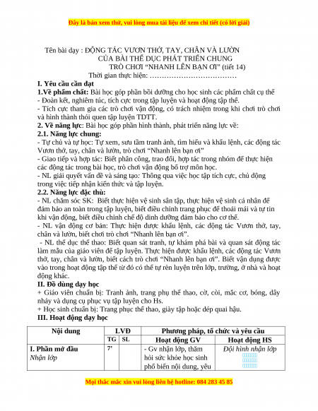 Tên bài dạy: ĐỘNG TÁC VƯƠN THỞ, TAY, CHÂN VÀ LƯỜN