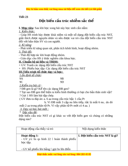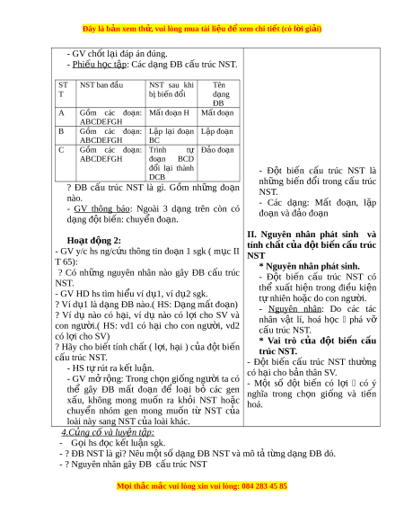 Đây là bản xem th , vu ử i lòng mua tài li u ệ đ xe ể m chi ti t (c ế ó l i ờ gi i ả ) - GV chốt l i ạ đáp án đúng. - Phi u h ế c t ọ p ậ : Các d ng ạ ĐB c u t ấ rúc NST. ST NST ban đầu NST sau khi Tên T b bi ị ến đổi dạng ĐB A G m ồ các đo n: ạ Mất đoạn H Mất đoạn ABCDEFGH B G m ồ các đo n: ạ Lặp lại đo n ạ Lặp đoạn ABCDEFGH BC C G m ồ các đo n: ạ Trình tự Đảo đoạn ABCDEFGH đoạn BCD đ i ổ l i ạ thành - Đ t ộ bi n ế c u ấ trúc NST là DCB nh ng ữ bi n ế đ i ổ trong c u ấ trúc ? ĐB c u ấ trúc NST là gì. G m ồ nh ng ữ đo n ạ NST. nào. - Các d ng: ạ M t ấ đo n, ạ l p ặ