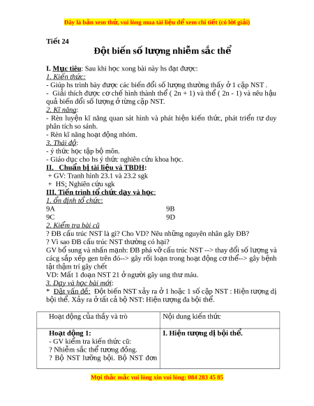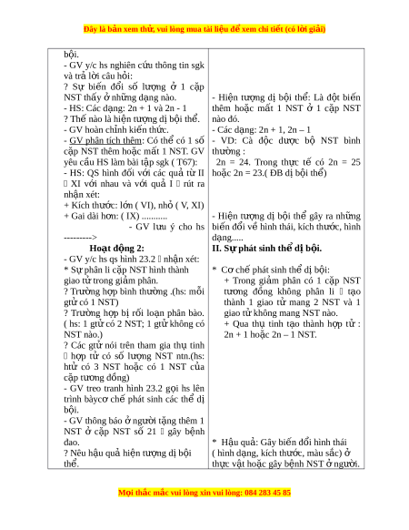 Đây là bản xem th , vu ử i lòng mua tài li u ệ đ xe ể m chi ti t (c ế ó l i ờ gi i ả ) b i ộ . - GV y/c hs nghiên c u ứ thông tin sgk và tr l ả i ờ câu h i ỏ : ? Sự bi n ế đ i ổ số lư ng ợ ở 1 c p ặ NST th y ấ nh ở ng d ữ ng ạ nào. - Hi n ệ tư ng ợ dị b i ộ th : ể Là đ t ộ bi n ế - HS: Các d ng: ạ 2n + 1 và 2n - 1 thêm ho c ặ m t ấ 1 NST ở 1 c p ặ NST