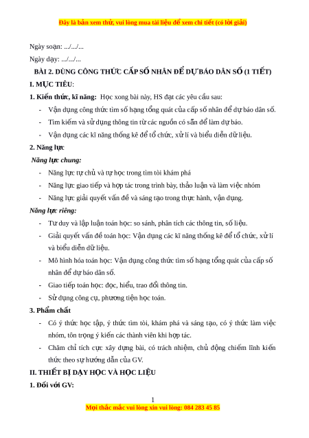 ứ , kĩ năng: H c ọ xong bài này, HS đ t ạ các yêu c u ầ sau: - V n ậ d n ụ g công th c ứ tìm s ố h n ạ g t n ổ g quát c a ủ c p ấ s ố nhân đ ể d ự báo dân s . ố - Tìm ki m ế và s ử d n ụ g thông tin t ừ các ngu n ồ có s n ã̃ đ ể làm d ự báo. - V n ậ d n ụ g các kĩ năng th n ố g kê đ ể t ổ ch c, ứ x ử lí và bi u ể di n ễ d ữ li u ệ . 2. Năng l c ự Năng l c ự chung: - Năng l c ự t ự ch ủ và t ự h c ọ trong tìm tòi khám phá - Năng l c ự giao ti p ế và h p