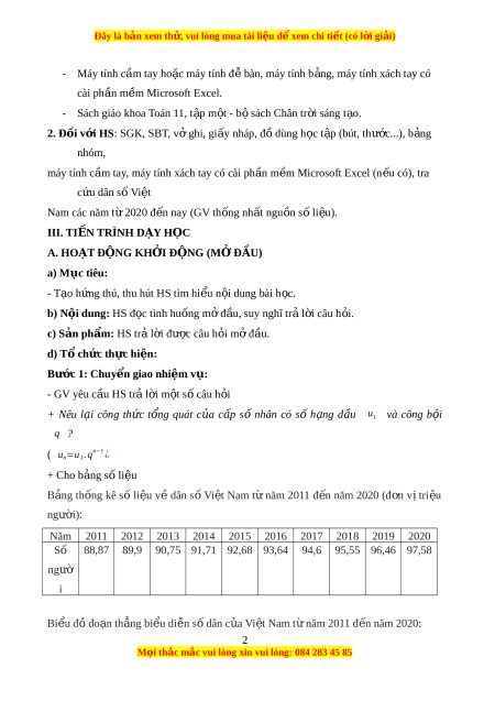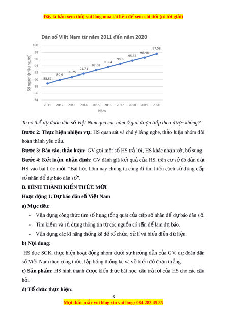 B. HÌNH THÀNH KI N Ế TH C Ứ M I Ớ Ho t ạ đ ng ộ 1: D ự báo dân s ố Vi t ệ Nam a) M c ụ tiêu: - V n ậ d n ụ g công th c ứ tìm s ố h n ạ g t n ổ g quát c a ủ c p ấ s ố nhân đ ể d ự báo dân s . ố - Tìm ki m ế và s ử d n ụ g thông tin t ừ các ngu n ồ có s n ã̃ đ ể làm d ự báo. - V n ậ d n ụ g các kĩ năng th n ố g kê đ ể t ổ ch c, ứ x ử lí và bi u ể di n ễ d ữ li u ệ . b) N i ộ dung: HS đ c ọ SGK, th c ự hi n ệ ho t ạ đ n ộ g nhóm d i ướ sự h n ướ g d n ẫ c a ủ GV, d ự đoán dân s ố Vi t ệ Nam theo công th c, ứ l p ậ b n ả g th n ố g kê và v ẽ bi u ể đ ồ đo n ạ th n ẳ g. c) Sản ph m