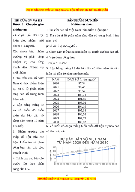 Đây là bản xem th , vu ử i lòng mua tài li u ệ đ xe ể m chi ti t ế (có l i ờ gi i ả ) HĐ CỦA GV VÀ HS SẢN PHẨM D Ự KI N Ế Bư c ớ 1: Chuy n ể giao Nhiệm v ụ nhóm: nhiệm v : ụ 1. Tra c u ứ dân s ố Vi t ệ Nam th i ờ đi m ể hi n ệ t i ạ : A - GV yêu c u ầ HS th c ự 2. Tra c u
