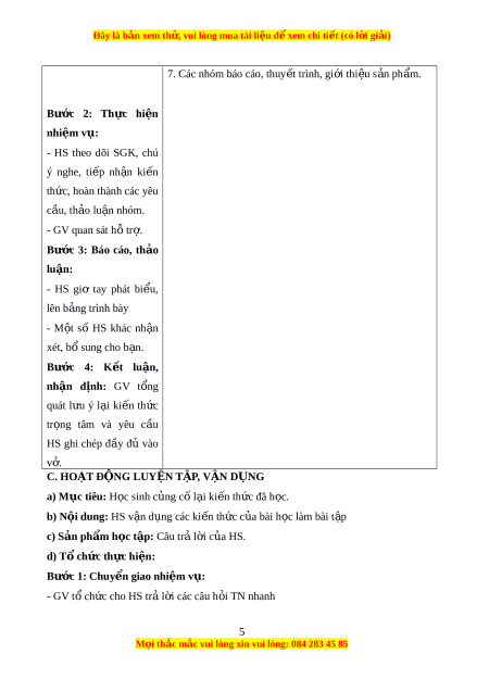 ụ HS quan sát và chú ý l n ắ g nghe, th o ả lu n ậ nhóm đôi hoàn thành yêu c u ầ . Bư c ớ 3: Báo cáo, th o ả lu n: ậ GV g i ọ m t ộ s ố HS tr ả l i ờ , HS khác nh n ậ xét, b ổ sung. Bư c ớ 4: K t ế lu n, ậ nh n ậ đ nh: ị GV đánh giá k t ế qu ả c a ủ HS, trên c ơ s ở đó d n ẫ d t ắ HS vào bài h c ọ m i ớ . “Bài h c