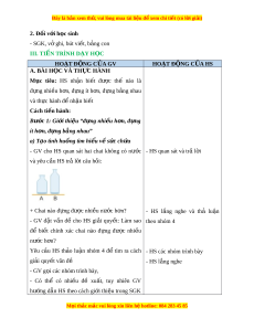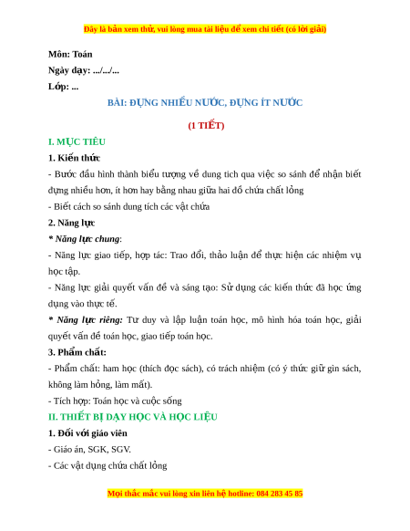 Ngày dạy: .../.../... L p: ớ ... BÀI: Đ N Ự G NHI U Ề NƯ C Ớ , Đ N Ự G ÍT NƯ C Ớ (1 TIẾT) I. M C Ụ TIÊU 1. Ki n t ế h c ứ - Bư c ớ đ u ầ hình thành bi u ể tư ng ợ về dung tich qua vi c ệ so sánh để nh n ậ bi t ế đ ng nhi ự u ề h n, í ơ t h n hay b ơ ng ằ nhau gi a hai ữ đ ch ồ a ch ứ t ấ l ng ỏ - Bi t
