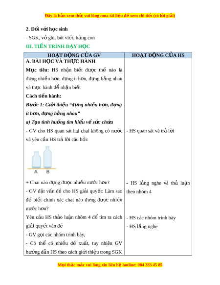 Đây là bản xem th , vu ử i lòng mua tài li u ệ đ xe ể m chi ti t (c ế ó l i ờ gi i ả ) 2. Đ i ố v i ớ h c s ọ inh - SGK, v ghi ở , bút vi t ế , b ng con ả III. TI N Ế TRÌNH D Y Ạ H C Ọ HOẠT Đ N Ộ G C A Ủ GV HOẠT Đ N Ộ G C A Ủ HS A. BÀI H C Ọ VÀ TH C Ự HÀNH Mục tiêu: HS nh n ậ bi t ế đư c ợ thế nào là đ ng ự nhi u ề h n, ơ đ ng ự ít h n, ơ đ ng ự b ng ằ nhau và th c ự hành đ nh ể n ậ bi t ế Cách ti n hà ế nh: Bước 1: Gi i ớ thi u ệ “đ ng ự nhi u ề h n, ơ đ ng ự ít h n, đ ơ ng b ự ng nhau” ằ