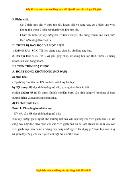 - Nhận biết, mô tả được đường thẳng song song với mặt phẳng trong thực tế.