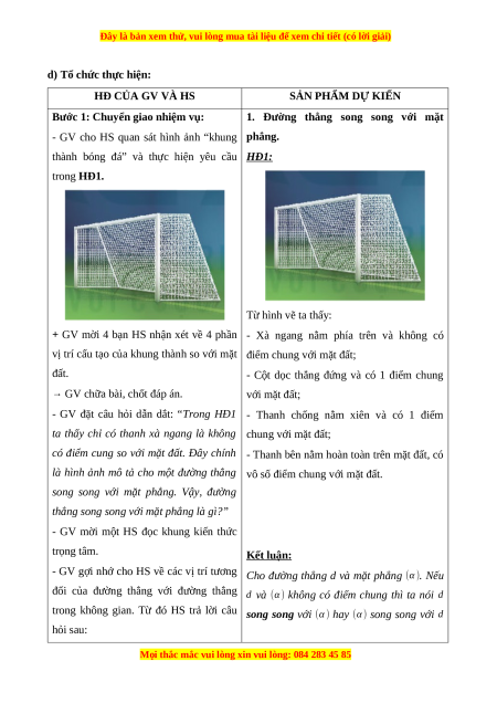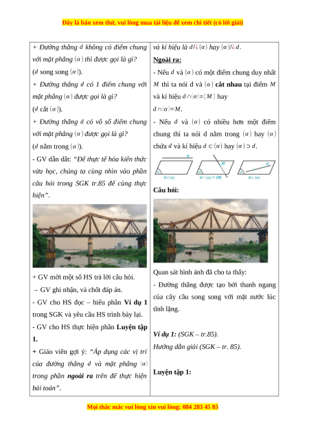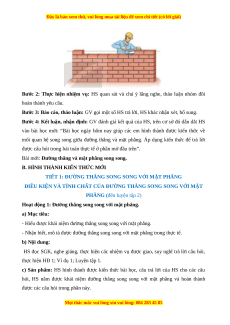 - Nhận biết, mô tả được đường thẳng song song với mặt phẳng trong thực tế. b) Nội dung: