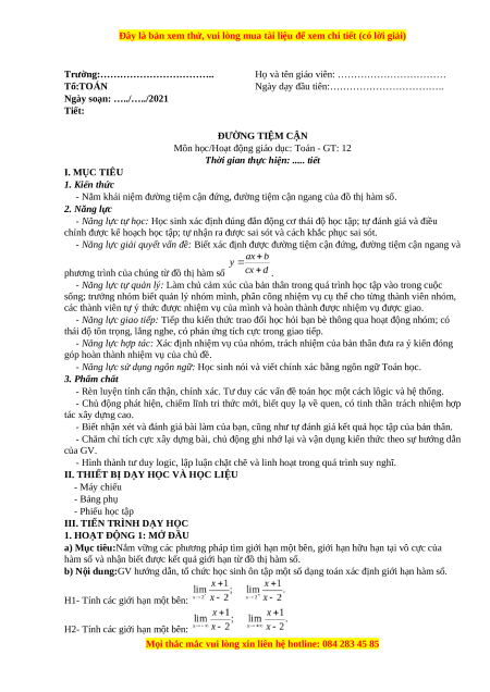 Giáo án Đường tiệm cận Toán 12 Giải tích