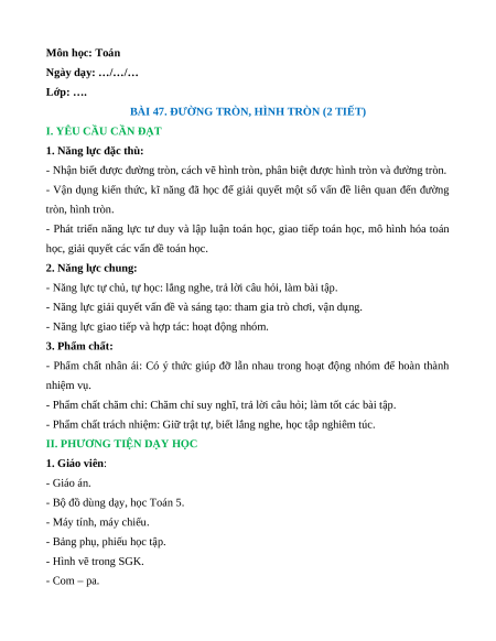BÀI 47. ĐƯỜNG TRÒN, HÌNH TRÒN (2 TIẾT)
