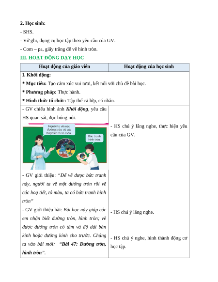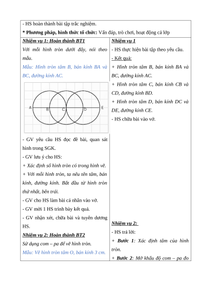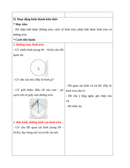 - HS nhận biết được đường tròn; cách vẽ hình tròn; phân biệt được hình tròn và đường tròn. * Cách tiến hành:
