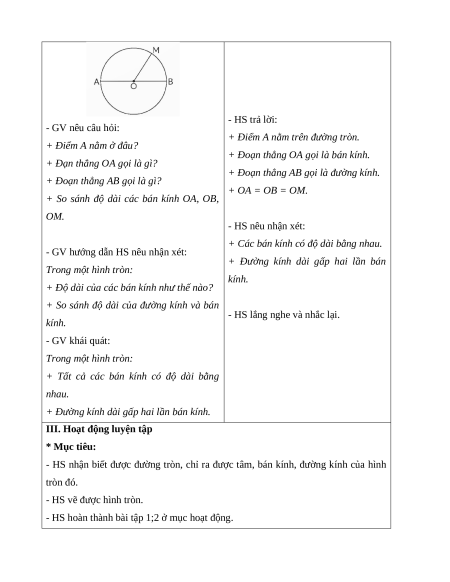- HS nhận biết được đường tròn, chỉ ra được tâm, bán kính, đường kính của hình tròn đó.