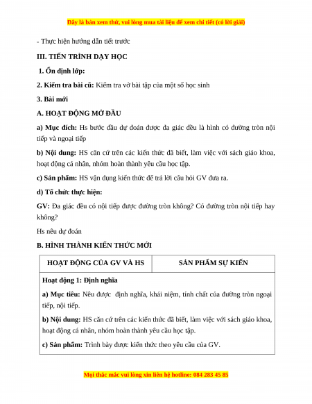 a) Mục tiêu: Nêu được định nghĩa, khái niệm, tính chất của đường tròn ngoại tiếp, nội tiếp.